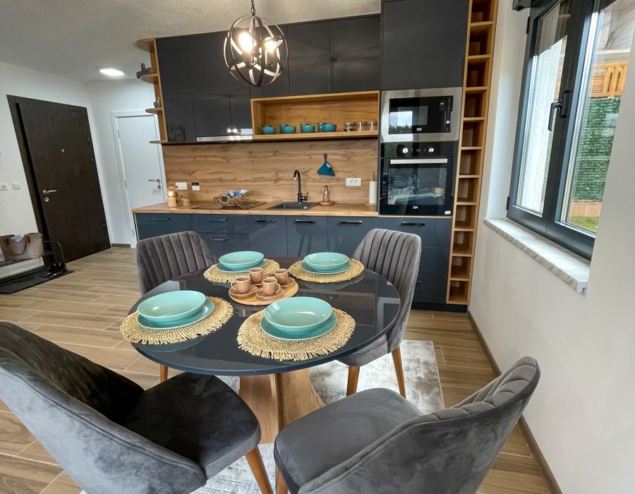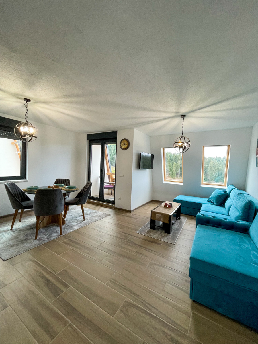 The “Ravna Planina” apartments are located in the center of the “Ravna Planina” ski resort. All apartments have a separate entrance and are equipped to the latest standards. The size of the apartments ranges from 27 m2 to 45 m2. Apartments include a fully equipped kitchen, TV, large French bed, a terrace with a view of the gondola, free Wi-Fi, and parking. We offer apartments with one and two bedrooms. The maximum capacity of the apartments is 6 people. The apartments have spring water.